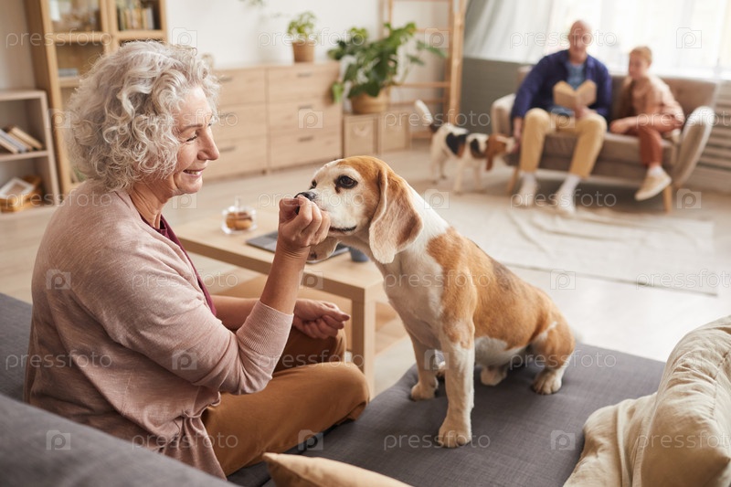 Улыбающаяся пожилая женщина играет со старшей собакой