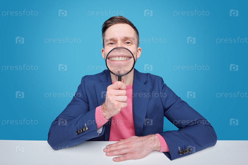 Забавный молодой человек, держащий лупу рядом со своей зубчатой улыбкой
