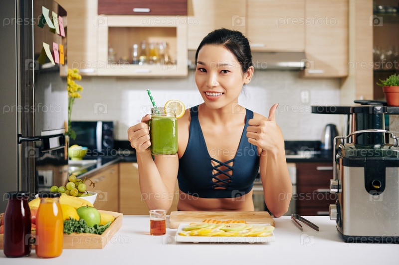 Веселая женщина с чашкой смузи