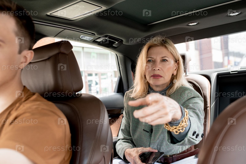 Зрелая блондинка-бизнесмен, сидящая на заднем сиденье такси и указывающая на дорогу