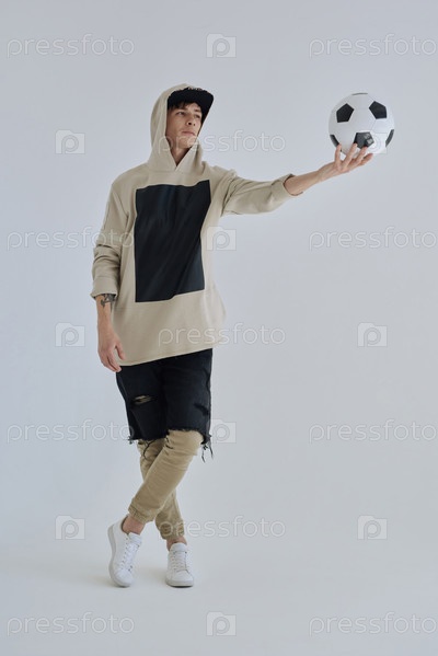 Позируя с мужчиной из футбольного мяча