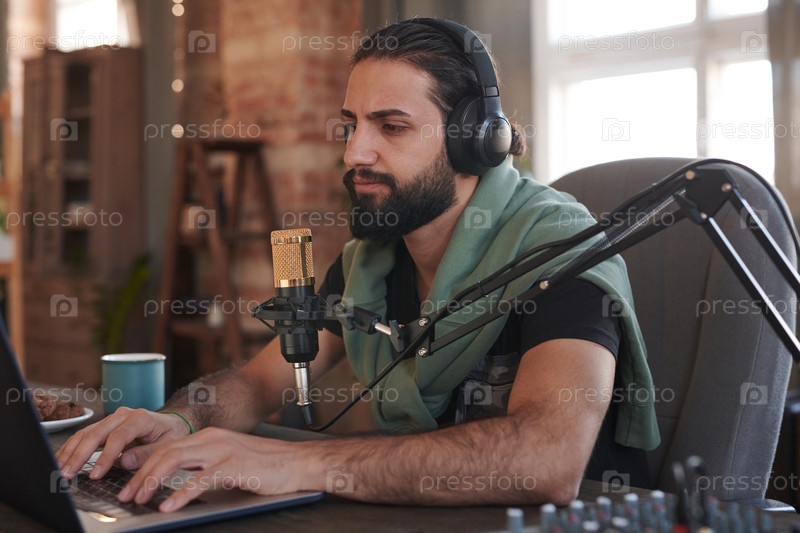 Горизонтальный средний портрет молодого взрослого ближневосточного мужского блогера с наушниками, сидящего за столом в комнате на чердаке и использующего ноутбук