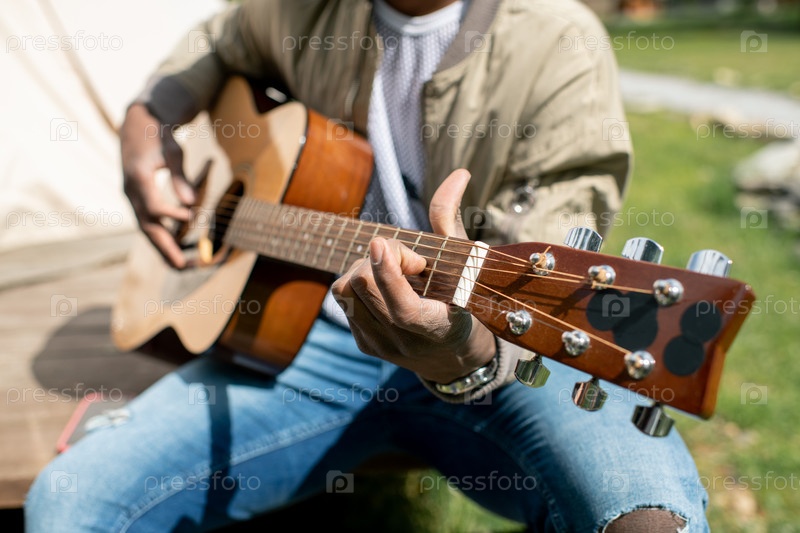 Играя на акустической гитаре на свежем воздухе