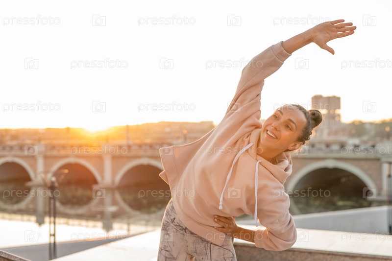 Молодая веселая спортсменка в капюшоне и брюках делает боковые полосы на свежем воздухе