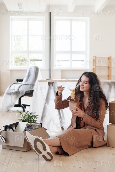 Позитивная красивая девушка с кудрявыми волосами сидит среди передвижных ящиков на полу и наслаждается китайской едой в офисе после ремонта
