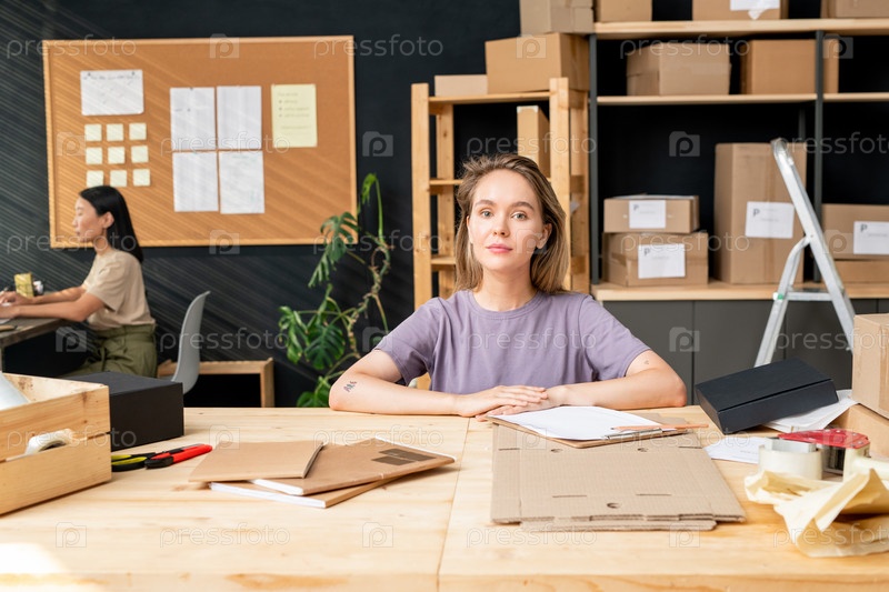 Молодая красивая работница офиса интернет-магазина, которая смотрит на тебя во время проверки данных