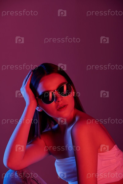 Довольно гламурная девушка в солнцезащитных очках и белом танкере позирует перед камерой