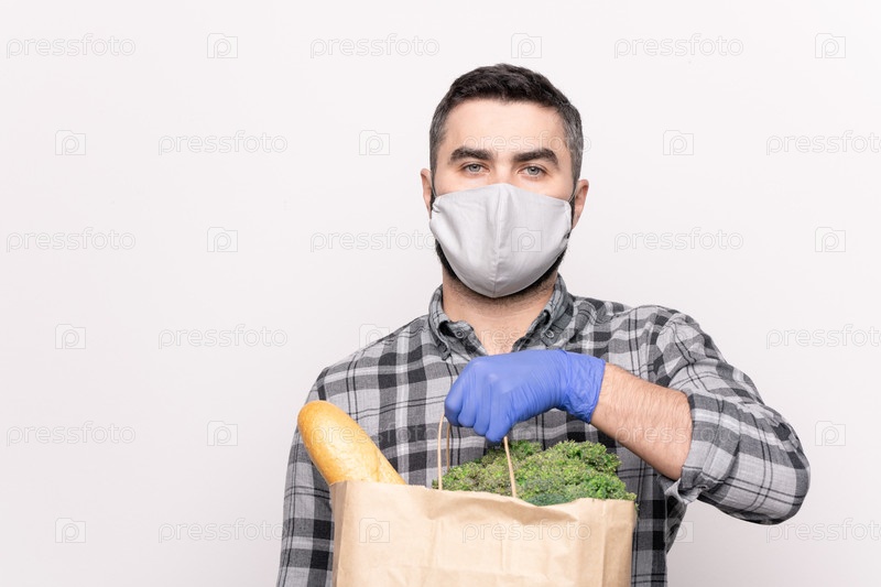 Молодой курьер в защитной маске и перчатках доставляет свежий хлеб и овощи