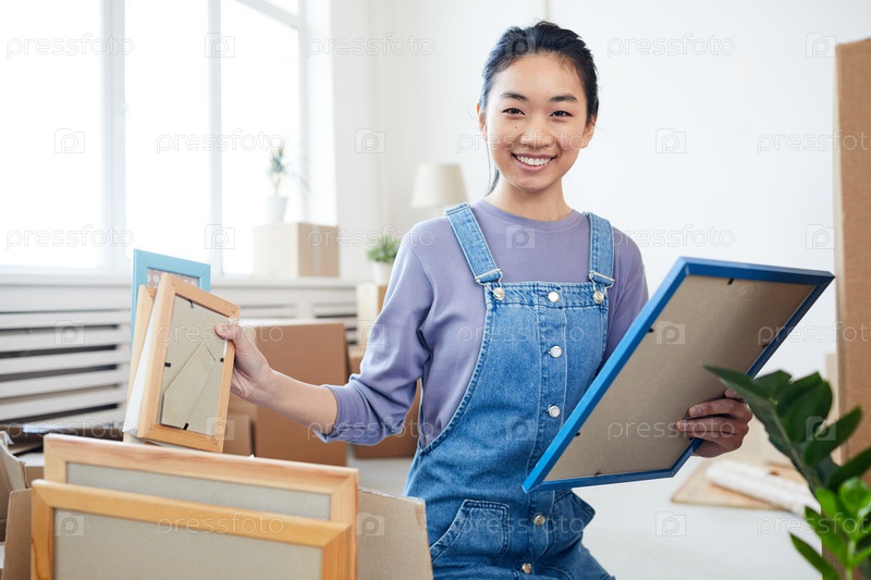 Азиатская женщина позирует в своем новом доме Happy