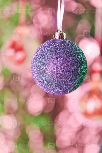 Синее сферическое украшение, покрытое крошечными блесками, висящими перед камерой