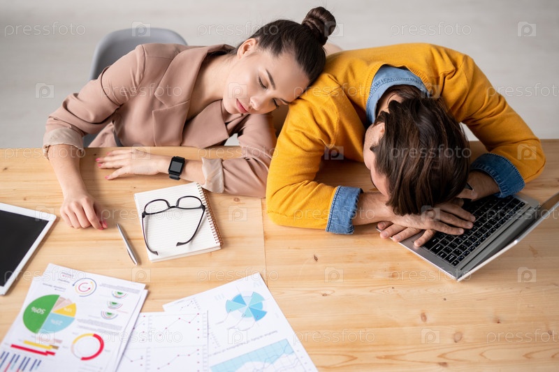 Два молодых изможденных брокера дремлют у своего стола после тяжелого рабочего дня в офисе