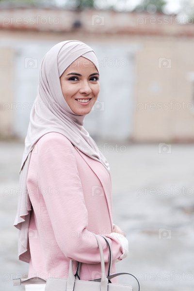 Молодая веселая мусульманка в хиджабе и розовом кардигане, держащая сумочку