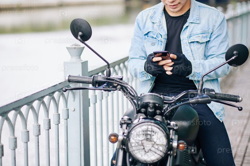 Улыбающийся байкер отправляет сообщения своему другу