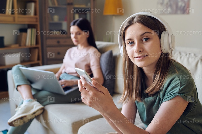 Красивая девочка-подросток с светлыми волосами держит смартфон, выбирая музыку