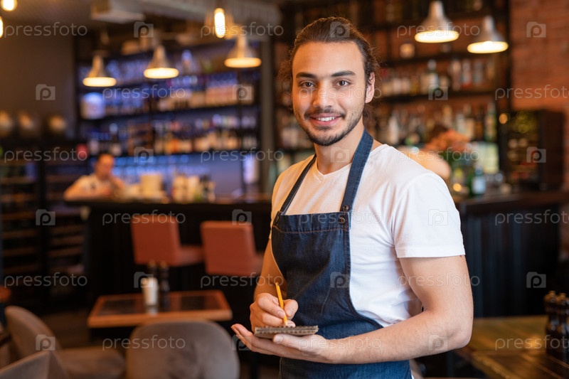 Молодой улыбающийся официант в рабочей одежде делает заметки в блокноте во время работы