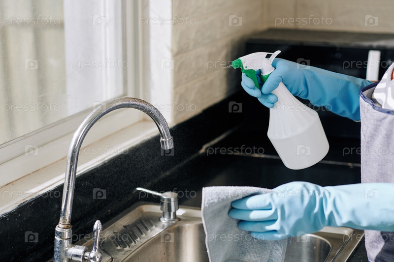 Домашняя хозяйка распыляет кухонный кран