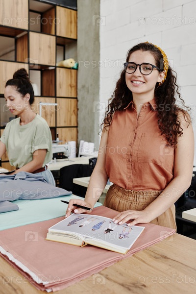 Молодой веселый портной или модный дизайнер в умных повседневных одеждах смотрят на вас