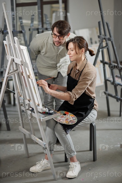 Красивая молодая студентка работает над живописью с учителем, стоящим рядом