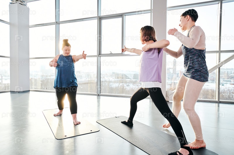 Молодой тренер по йоге помогает двум активным женщинам заниматься на ковриках