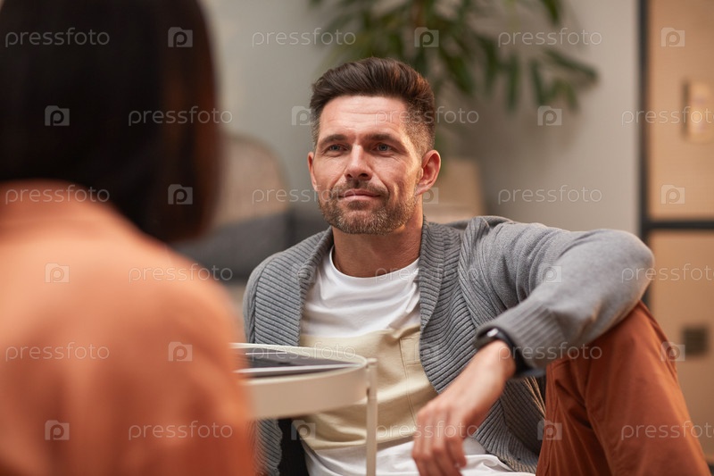Современная пара, разговаривающая в гостиной