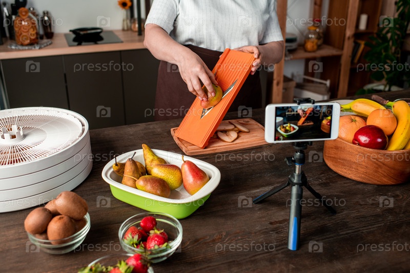 Домашняя хозяйка или блоггер стоит за кухонным столом перед камерой смартфона