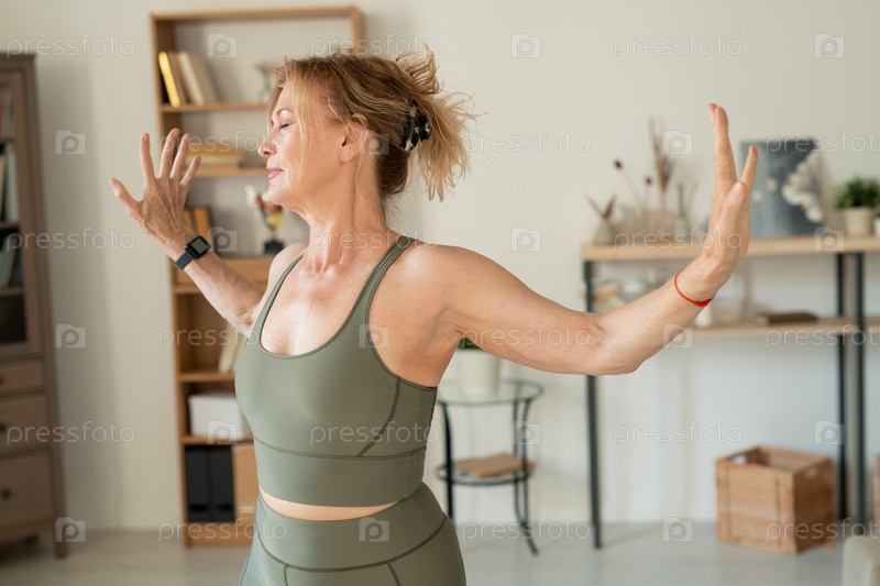Оптимистичная женщина средних лет в сером упругом спортивном костюме, выполняющая физические упражнения
