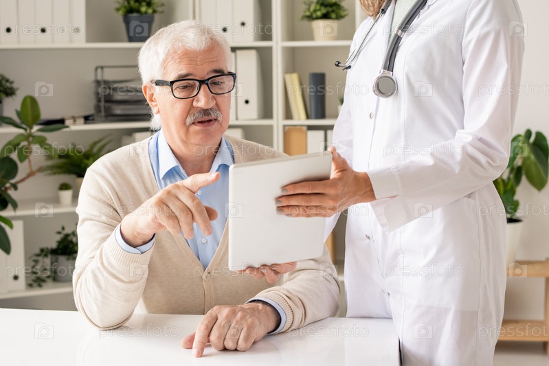 Пожилой мужчина в очках указывает на дисплей цифрового планшета, который держит врач