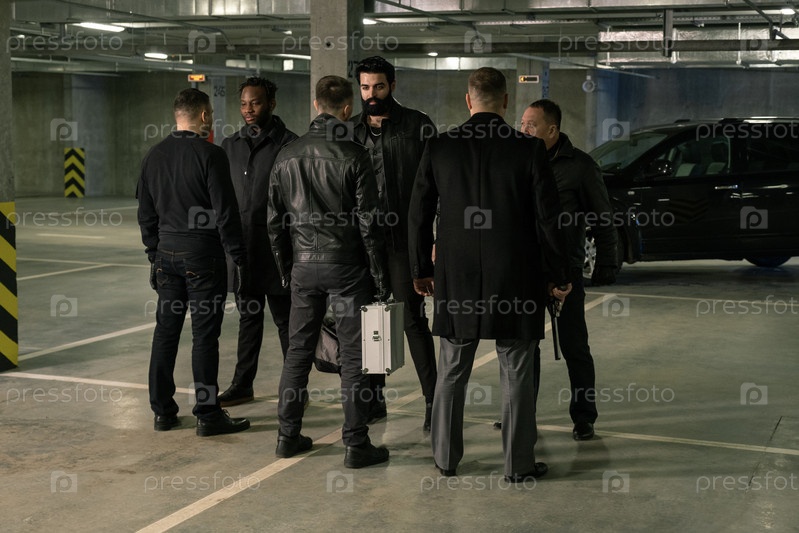 Группа из шести межкультурных мужчин в черном, стоящих друг перед другом