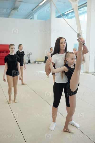 Учитель по чирлидингу поддерживает девочку, делающую вертикальный стоячий сплит