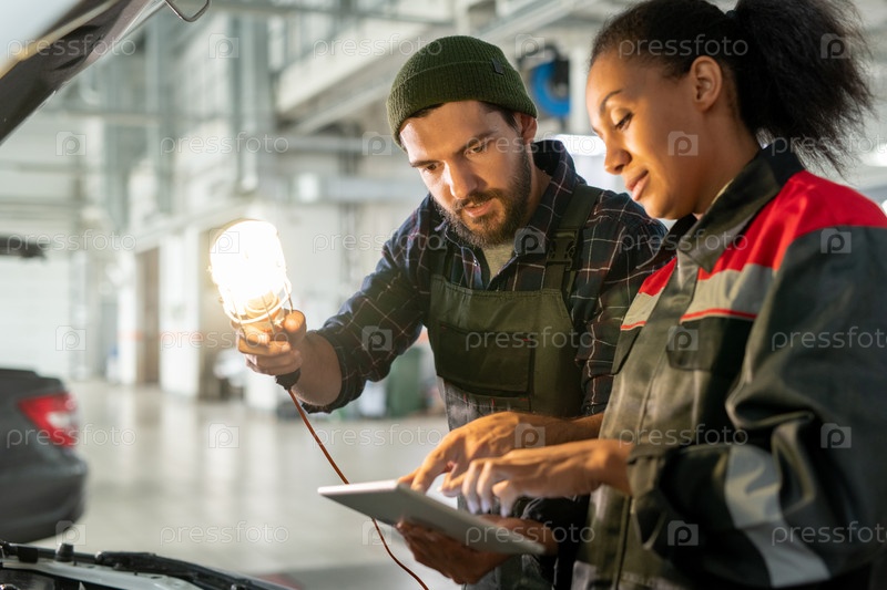 Молодой бородатый мужчина в рабочей одежде указывает на дисплей планшета, который держит его коллега