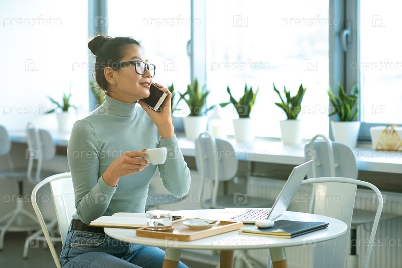 Счастливая молодая бизнесвумен в повседневной одежде, пьет чай и разговаривает по мобильному телефону