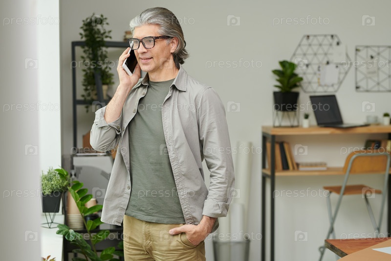 Улыбающийся красивый зрелый менеджер в очках, стоящий у окна и общаясь по сотовому телефону в современном офисе