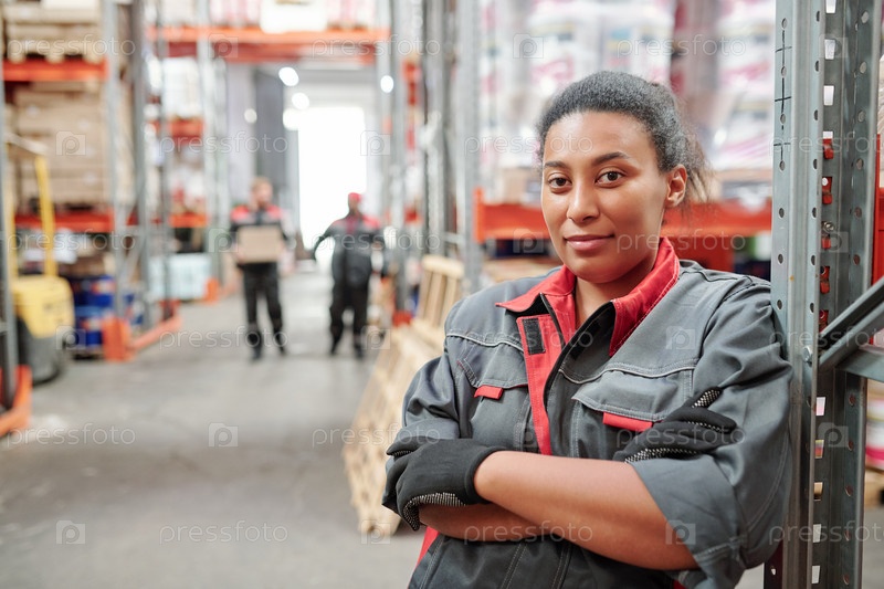 Серьезная молодая женщина смешанной расы в рабочей одежде и перчатках, скрестившая руки за грудь