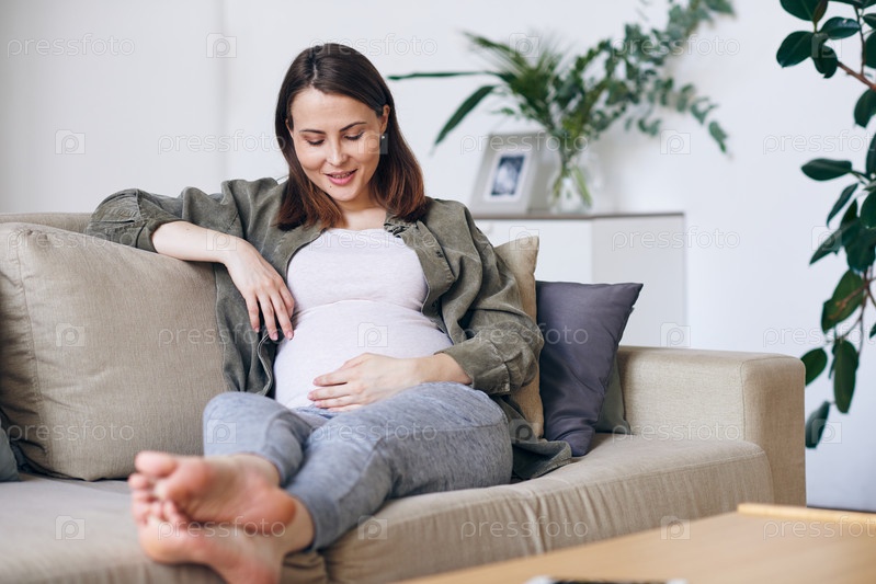 Молодая босоногая женщина в повседневной одежде смотрит на свой беременный живот, расслабляясь