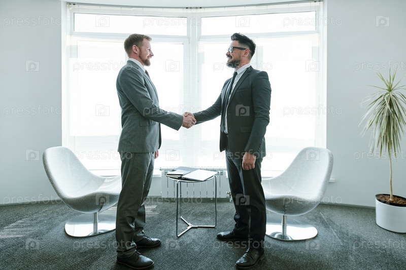 Два молодых успешных бизнесмена в костюмах, рукопожатые после переговоров