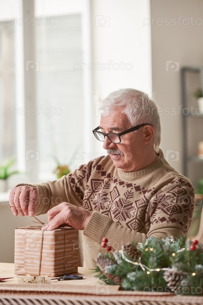 Концентрированный старший мужчина с усами сидит за столом и вяжет лук, готовя рождественский подарок для жены дома