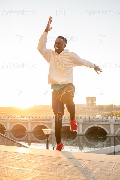 Экстатический спортсмен африканской этнической принадлежности прыгает с верхней ступени лестницы