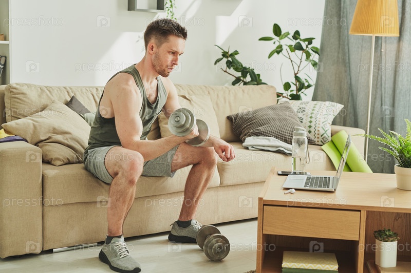 Молодой человек занимается гантели перед ноутбуком, глядя на дисплей