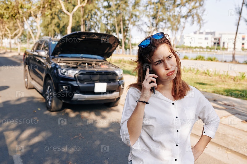 Стрессованная женщина звонит механику