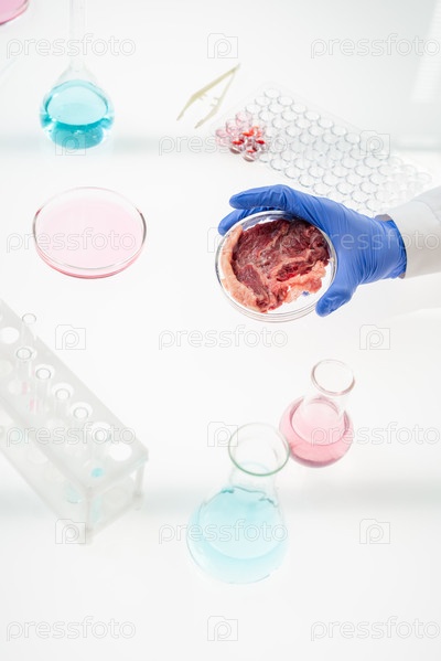 Исследователь держит чашу Петри с образцом сырого растительного мяса на рабочем месте