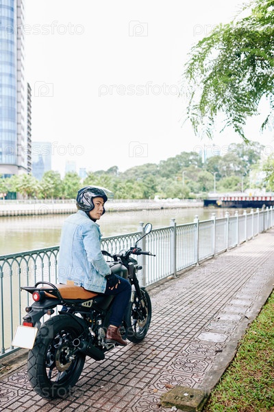 Мужчина в шлеме едет на мотоцикле