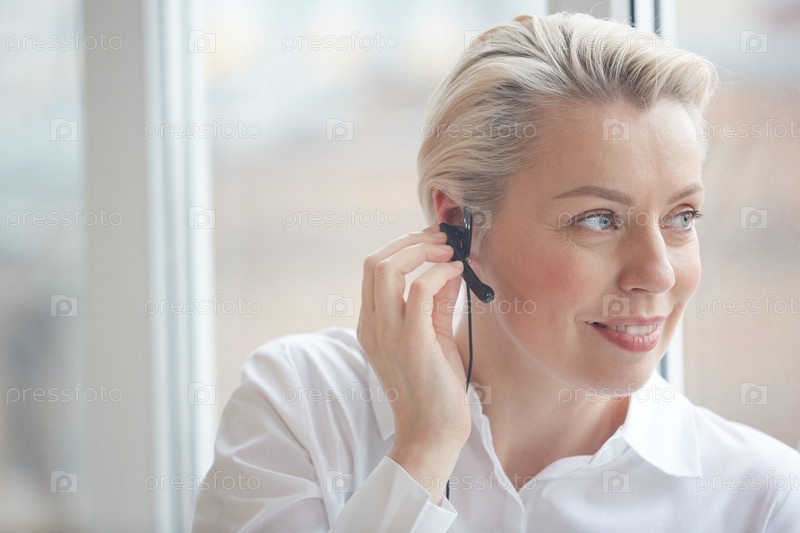 Блондинка-бизнесвумен, носящая гарнитуру