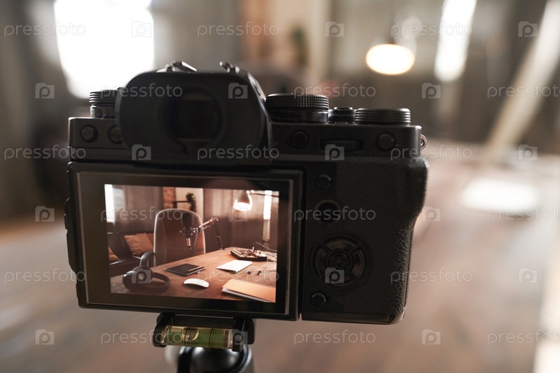Нет людей, которые выборочно сосредотачиваются на переднем плане - ближайшем снимке камеры и домашнего рабочего пространства, подготовленном для онлайн-стриминга