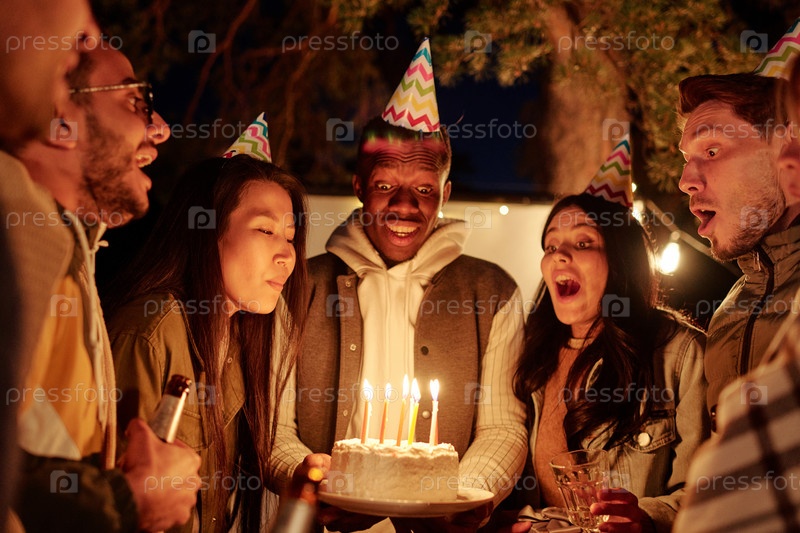 Группа молодых межкультурных друзей дуют свечи на рождественский торт