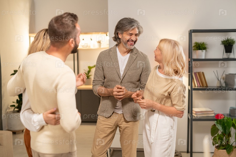 Две веселые пары в повседневной одежде обсуждают последние новости в гостиной