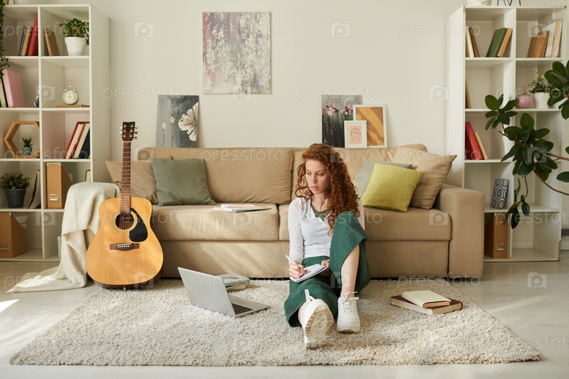 Вдумчивая молодая студентка с кудрявыми волосами, сидящая дома на полу и делающая заметки во время онлайн-лекции