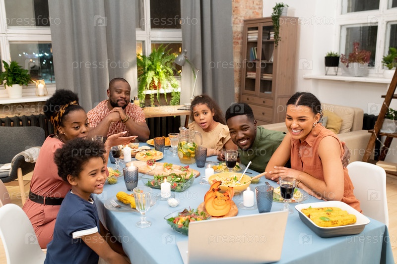Большая африканская семья поздравляет своих друзей в видеочате у праздничного стола