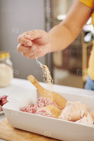 Женщина добавляет виды к мясу
