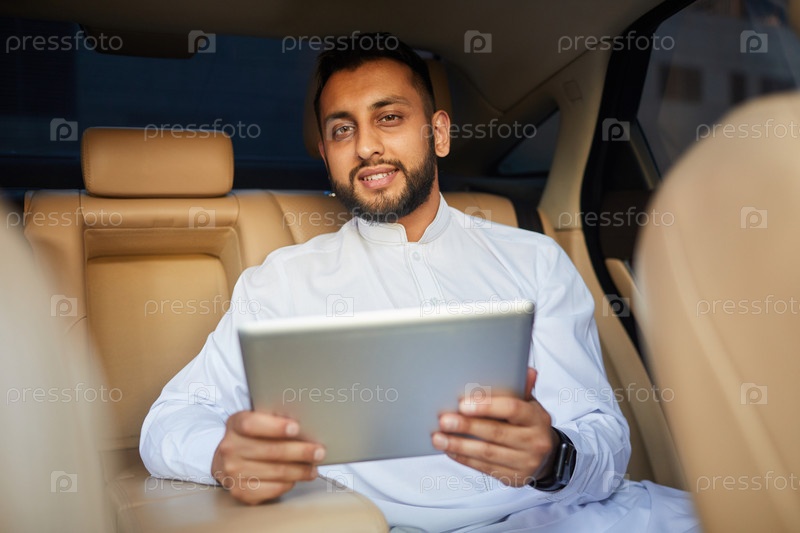Мужчина с планшетным компьютером в машине