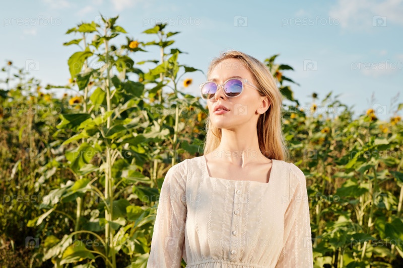 Блондинка в солнцезащитных очках и белом платье стоит перед камерой